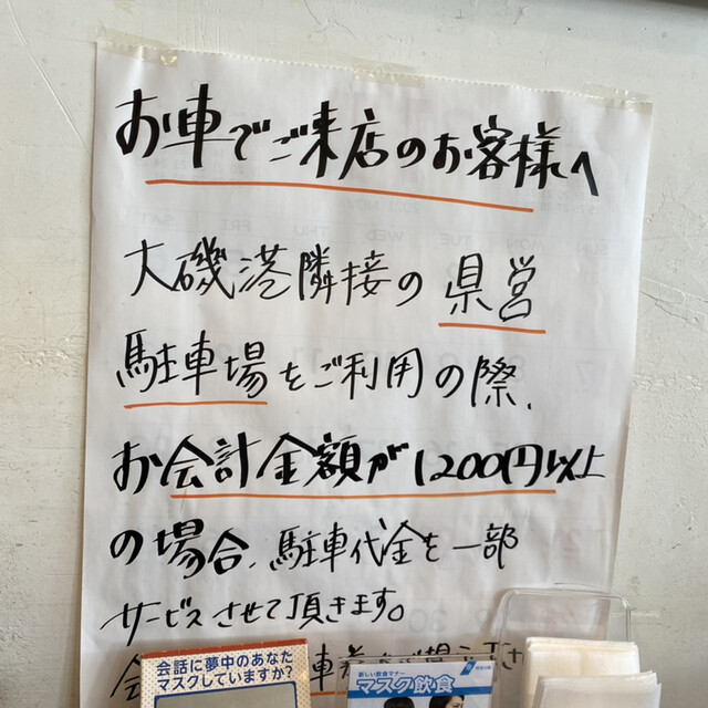 駐車場についていろいろ情報がでているが、店の前には停められなくなり、みんな県営の駐車場に停めるしかない。1時間310円。お店を利用すると200円現金で支給される。一回310円かと勘違いして、1時間超えて620円になっちゃった。くれぐれもご注意を。