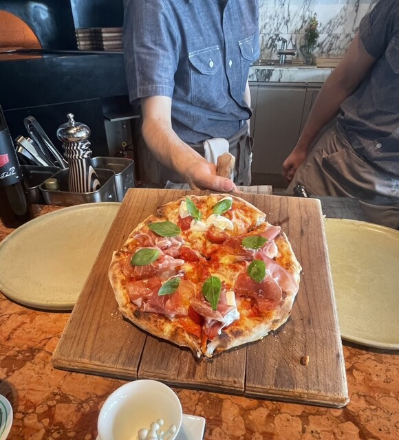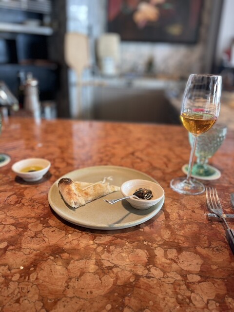 新鮮で味のあるお野菜、風味豊かなチーズとスペシャルな生地が織りなすピッツァは、まさにエンターテイメント!目の前で仕上げられていく様に好奇心がくすぐられていきます。マルゲリータ、マリナーラから、アワビとカラスミのピッツァに4種のチーズを包み込んだフォカッチャ、山の恵みがたっぷり山菜のピッツァ、クアトロフォルマッジを越える7種のチーズのピッツァ。クリーミーなモツァレラ、濃厚なゴルゴンゾーラ、ピッツァを口一杯に頬張れば、すぐに幸せな気持ちになれます。全部美味しかったのですが、山菜のピッツァが鮮烈で印象的でした。素敵なピッツァイオーロが最初から最後まで美味しいピッツァを楽しませてくれながら届けてくれます。ご馳走様でした。