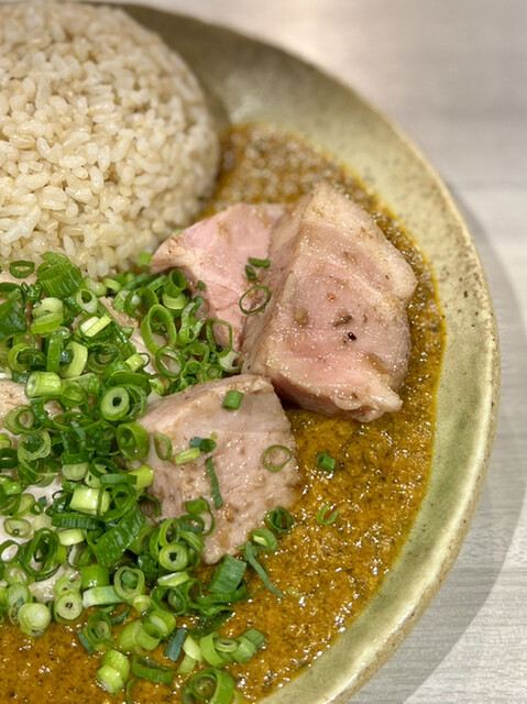 ほぐし鶏のバターチキンカレー・角切りローストポーク・ニラとネギのアチャール・中華アチャール