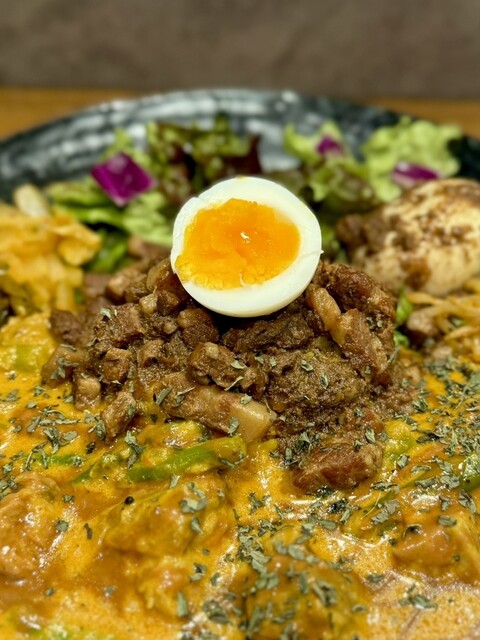 ろかプレート(濃厚牛肉とアスパラガスのカレー ~特製デーツソースを添えて~(限定))・ルー増し・ライス大盛り・るうろう煮玉子・肉ダブル