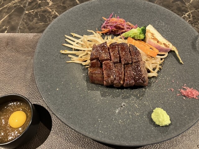 わさび、ワイン塩、卵黄入り玉ねぎソースをお好みで付けてくださいとのこと。どれも美味しいですが、お肉に塩コショウで味が付いているのでワサビを少し付けるくらいが丁度良いように感じました。