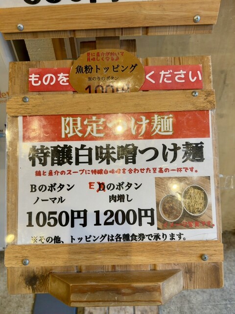 いつもはブラックを食べるのですが、限定の白味噌つけ麺があったとので肉増しを注文。麺は大盛無料で300g、辛み100円を追加しました。白味噌の香りと甘み、ほのかな味わいを感じる鶏と魚介のスープはおいしかったです。平打ちちぢれ麺の太麺もスープがよく絡み、良いです。途中で辛みを入れて味変したところ、辛党の私でもめちゃくちゃ辛いと思うほど激辛になりました。最後はスープ割りを足してもらってお腹いっぱいです。