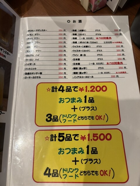 少し値上がりしたようですが、例外もありますが基本350円で料理もドリンクも統一。