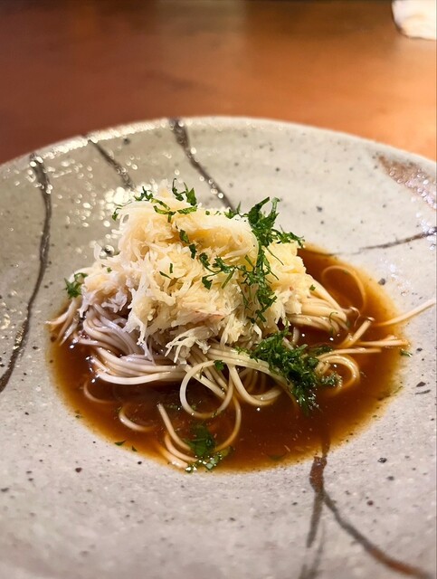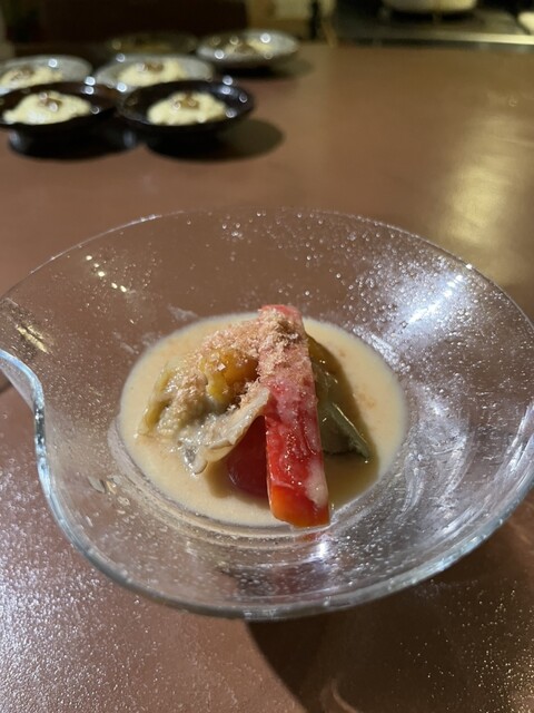 さらに蟹殻と香味野菜から取った餡が別添えでかかり、甲殻の香りと野菜のコクが重なって、ソースまできれいにすくいたくなる料理でした