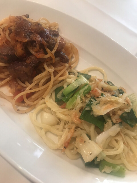 パスタ【カラスミとカブ】+リガトーニ【炭火焼鶏とパプリカのラグー】