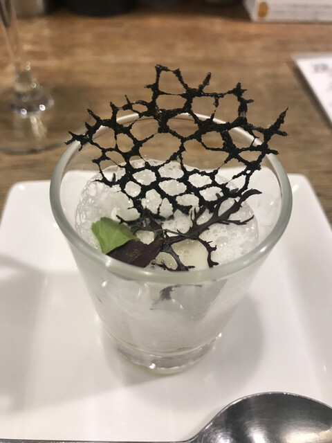 イカ墨で出来た蜘蛛の巣のような泡泡の下にはホタテなどが入っていて旨い❤