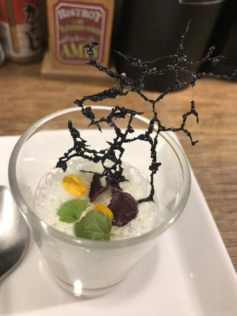 この日はイカ墨の飾り付けが素敵な逸品です❤中身は魚貝とバターの泡❤
