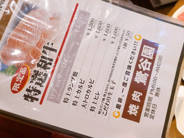 そして来店当日、予約5分くらい前に到着し受付で名前を言うとすぐに案内され着席できた。時間は90分制(LO30分前)だ。まずは飲み物を注文、その時に取置きしてもらってたお肉の確認をされる(今回は特上タン、特上ランプ、特上ヒレ)。