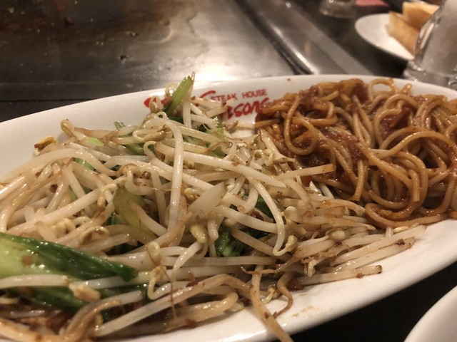 スープ、サラダ、もやし炒め&本日のオススメのパスタ(ミートソース)、リブステーキ200g、ライスはガーリックライスに変更。