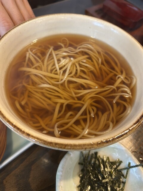 先に運ばれてきた、そばがきのもっちりした柔らかさに感動!ざる蕎麦の喉越しやコシが秀逸で、さすが百名店と言われるだけある。また、ツレが頼んだかけそばの鰹出汁が効いたつゆ、多彩なキノコの天ぷらが美味しく。どこにも隙がない満点のお蕎麦でした。ツレと共々感動レベル。