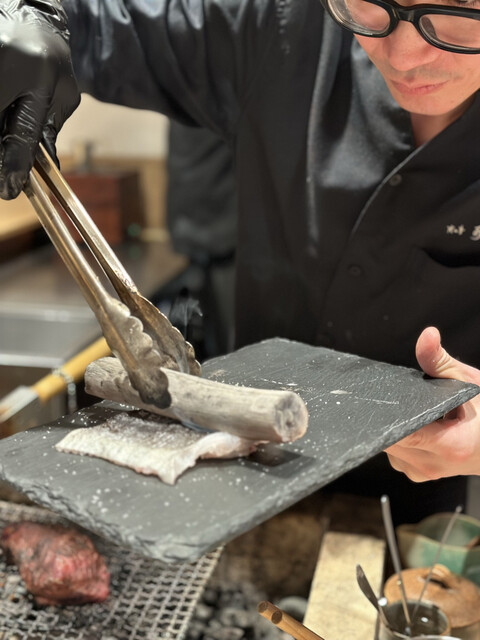 カウンターの真ん前に大きな囲炉裏のような炭焼き場。