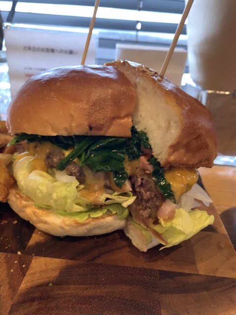北海道産の牛肉100%パティはニクニクしくてジューシー。パンズも十勝産の小麦で、しっとりしてふわふわで大きなバンズです。