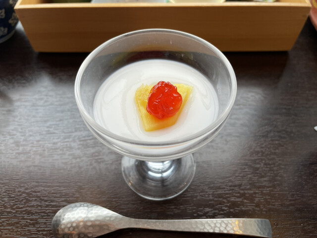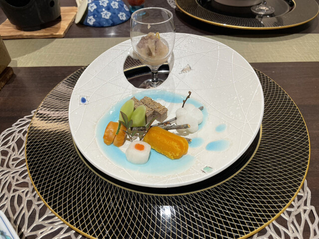 同じ梅酒の食前酒にせよ、今日は切子のグラスで綺麗でした。