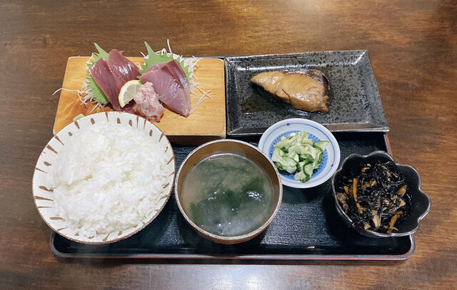 ご飯は丼鉢に大盛りの量、分厚いカツオとネギトロの刺身、鰤の煮付け、ひじきの小鉢、瓜の漬物、ワカメの味噌汁で880円は信じられない位CPが良いです。