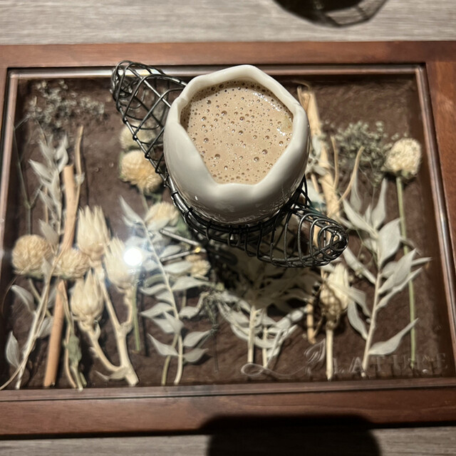 ポタージュの中にうずらの卵。非常に柔らかくパサつきも無い卵が濃厚なきのこポタージュに包まれています。うずらの卵ってこんなに美味しくなるものなのかと思いました。あと、卵の殻のような器とそれを背負う鳥が可愛い。