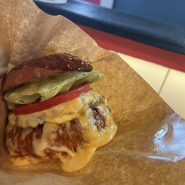店内はアメリカンテイストでかわいい。カウンター席に案内され、雰囲気を満喫。かなりのボリューム。肉の分厚さの溢れ出る肉汁。とろけたチーズ。カロリーの暴力。うますぎる。バンズも切り口は焼かれているのも良いです。完成度の高い最高のハンバーガーでした。