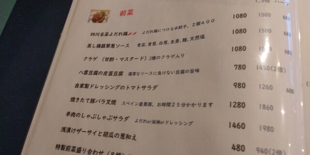 サーモンの入った野菜、よだれ鶏、冷たいスープ、えびチリ、ふわふわ、焼きそば(正式名は忘れました)すべて満足です。