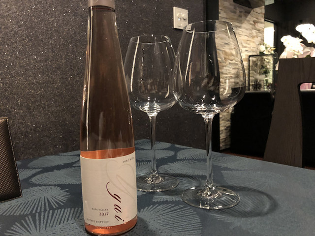 ハーフボトルでの注文です。ボトルはスッとしたオシャレなシェイプ。ワインの色も艶やかで優しい暖かみを感じさせるパールピンク。