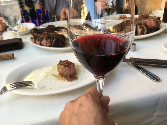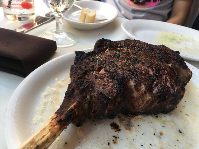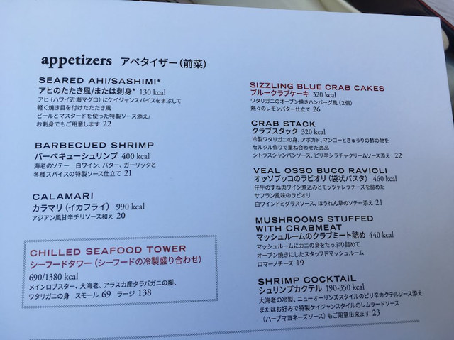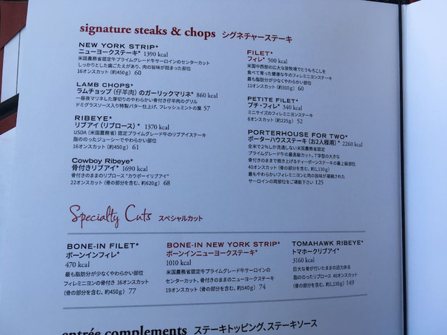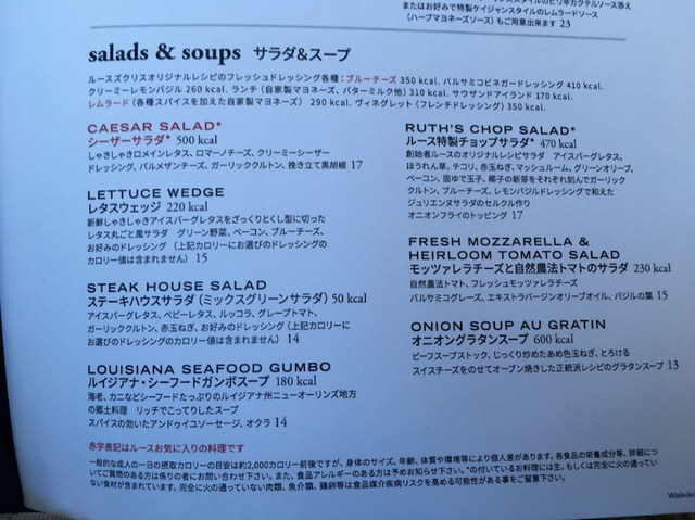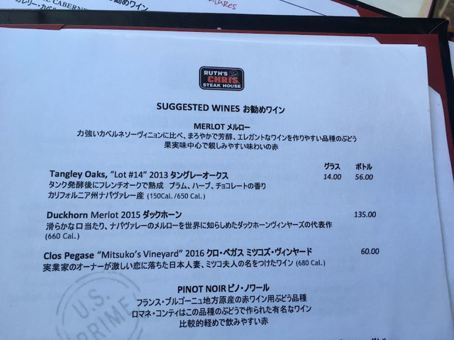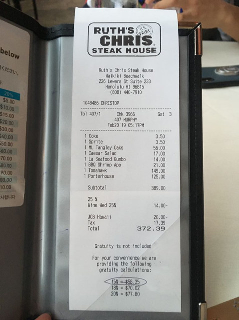 #おいしいお店を紹介するよ こちらはワイキキにあるお店。Ruth's Chris SteakHouse Waikiki-Oahu(+1)8084407910ハワイ226LewersStreet,WaikikiBeachWalk,Waikiki,HI96815https://tabelog.com/hawaii/A6001/A600101/60000005/ 2016年の有吉の夏休みという番組でも紹介されましたね。ここワイキキだけでなく、マウイ島、ハワイ島といったように5店舗、日本にもあります。今回、私の宿泊は『エンバシー・スイーツ・バイ・ヒルトン』でしたのでまさに同じビル。早速、行ってきました。 時間もはやかったので、誰も並んでいない!ラッキー♪ さすがワイキキ。日本語のメニューもあります。でも、テーブル担当は全く日本語出来ず。それで十分なんですがね。 4人での推奨を聞きます。すると、・Tomahawk Ribeye $149・Porterhouse For two $125辺りを頼むといいよ との返答。本当にそんなに食べれるのかしらと思いつつも、それを含めて…・Caeser Salad $17ロマーノチーズが美味しさを誘います。シャキシャキ野菜は新鮮そのもの。・Louisiana Seafood Gumbo $14ルイジアナニューオリンズの郷土料理。シーフードがたっぷり入っています。・BBQ Shrimp App $21エビのソテーです。ガーリックが程よく効いており大変美味しいそしてワインはTangley Oaks $56カルフォルニア州ナパバレー産のメルローの赤ワイン。深いルビー色でマイルドな口当たり。美味しいです!さて、テーブル担当が教えてくれたお肉がすごいんです。(冷静に考えたら値段もすごいですね) Porterhouse For twoプライムグレードの最高級のお肉です。Tボーンのまま焼かれ、肉汁もたっぷり。こちらのお店に来たらこれは注文すべきでしょう。Tomahawk Ribeyeどうですこれっ!はじめ人間ギャートルズにでも出てきそうな形ですよね!!ビックリしちゃいました。これがまたおいしいんです。高いだけあります。 お会計してビックリ。日本円で5万円近くかかっちゃいました。ひえーーーーーーーっ。でもタイトルにあるように、旅行に来てまでケチってはいけません。なぜなら、帰国して後悔しても、簡単に行ける場所にないのですから。