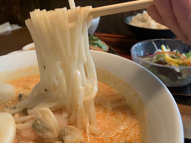 25年前シドニーで初めて出会ったシンガポールのヌードル、ラクサ(ココナッツスープにピリ辛なラー油や胡麻がベース。華僑が現地食材と中華を進化させた一品)えびを米粉麺に練り込んだハーミーヌードル。あの味に衝撃を受け、僕はシドニーに行く度に必ず食べてた大好物です。日本でラクサを食べられるのは恵比寿くらいでしたが、あちらは小麦麺と油揚げで一回しかいけませんでした 近年インスタントのラクサも発売されて喜びましたが全てが小麦麺という有様で麺だけ米粉フォーに差し替えスープだけ使って食べてました。しかし今回。東京駅でラクサを食べられる店を知り行ってみました。麺はうれしい米粉!えびと練り物ボール、味玉が添えてあり感動。レモングラスは使われてないのがちょっとだけ残念でしたが(僕は大好きだけど、あれは好みが分かれるでしょう。)スープも絶品でたまりません!大好きなインディカ米ご飯もついてて腹ペコオヤジにはぴったり!場所は三菱一号館の中庭を見下ろす素晴らしいロケーション、上品な店内、落ち着き気がきくスタッフさん。素晴らしい店です。美味しいひとときをありがとうございます。