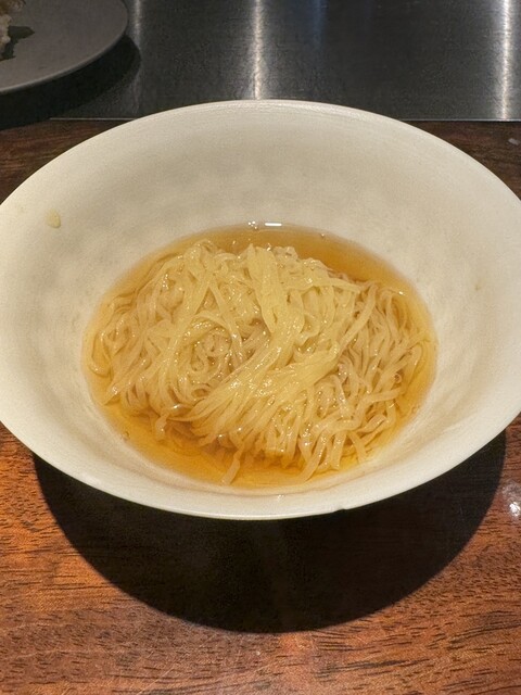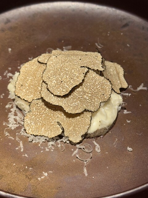 そして椀。藤本さんの鱧は、炙ってから蒸して花を咲かせ、骨から引いたコンソメで包む構成。仕上げの生姜オイルが香りをきゅっと引き締め、舌の上でふわっとほどけていく瞬間は思わず目を閉じたくなる幸福感。ここからトーンを一気に変えて、イカとトリュフの濃厚な一皿へ。トリュフのピュレとパルミジャーノのコクに、イカの甘みと火入れによる弾力が負けません。削ったトリュフの香りが立ちのぼるタイミングまで計算されていて、香りのピークで届けるプロの仕事。