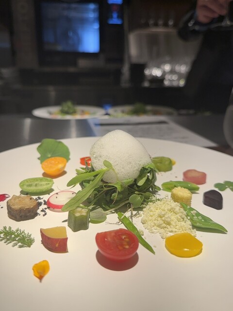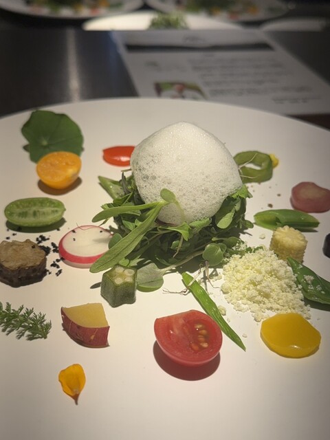彩りのマイクロリーフサラダは、北広島の野菜を焼く・乾燥・マリネと処理を変えて集合させた一皿。泡立てたヴィネグレットが全体を軽く包み、同じ素材でも温度や触感が変わるだけで味の表情が幾通りにも増えることを体感させてくれます。皿の上に小さな菜園が出現したみたいで可憐。