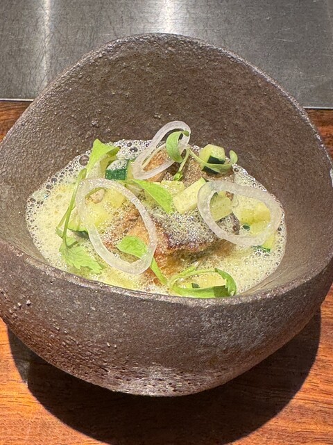 海からは瀬戸内のオコゼ。じゅんさいのぷるりとした食感に、柑橘とハーブ、そして指先ほどの酸味の粒が涼風を連れてきます。身は透明感を残した火入れで、噛むほどに旨みが染み出すタイプ。