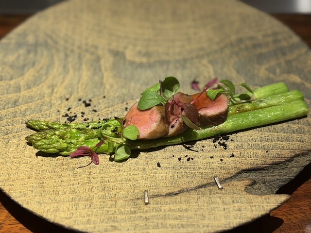 この日の序章はとうもろこし「ゴールドラッシュ」のスープ。口に含むと蜜のようなコクがふわっと広がり、後から皮を焼いた香りが追いかけてきます。甘みだけに寄らず青さをほんのり残す設計で、夏の入り口に立つ気分。