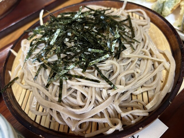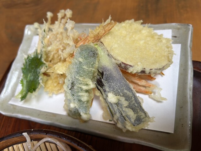 お時間に余裕のない方はご遠慮いただきたい。着席してオーダーをすると、すぐ蕎麦を切る音が。20分程待っている間に店内は8割満席。人気のお店だと分かります。お蕎麦はとにかくお水が良いのでしょうか。とても美味しい。汁も文句なし。天ぷらに至っては拍手したい程のサクサクとした揚げ具合に、えのきと人参、大葉に感動。