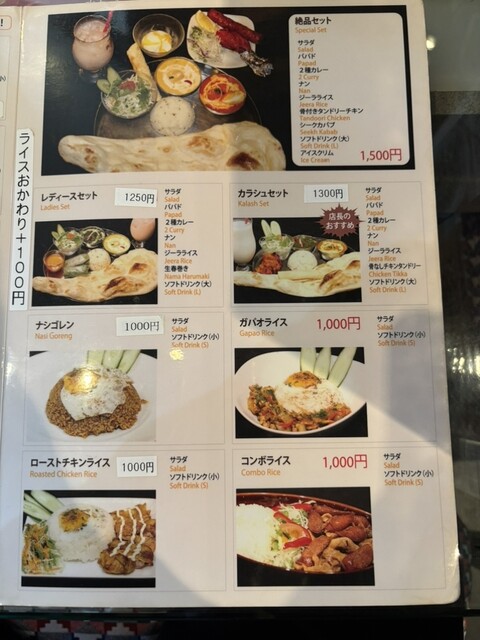 カレー屋さんにはよくあるセットですが、カレー(選択可)、ライスorナン(食べ放題)、サラダ、飲み物が付いて1000円程度で頂けます。土日も大丈夫ですので、大変お得だと思います。