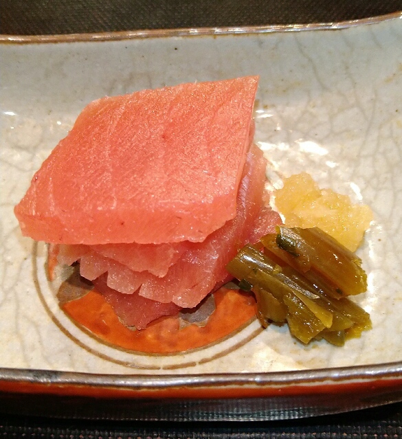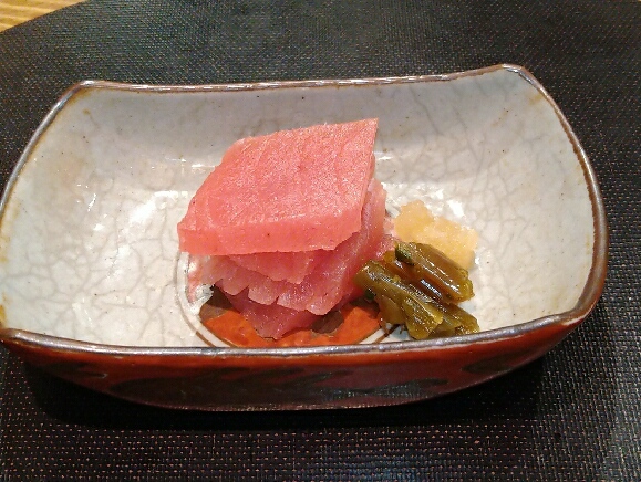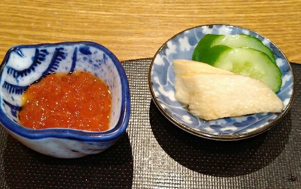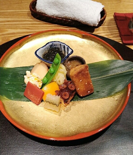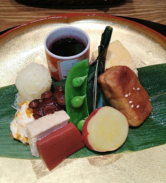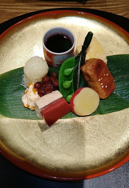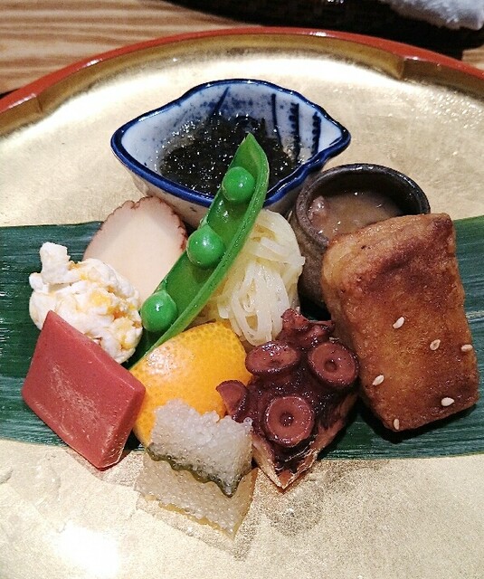 八寸、子持ち昆布、蛸柔らか煮、焼麩、このわた海鼠、もずく、いぶりがっこチーズ、クリームチーズ柿、赤蒟蒻、じゃがいもはりはりなど