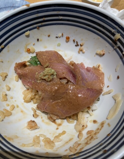 先ずはわさび醤油をかけて、海鮮丼として頂きました。言葉もなく夢中になります。少しご飯を残して、別皿の刺身を乗せて、鯛出汁をかけて頂きます。これが絶品で、温かい出汁ですが、暑さも何のその一気に完食してしまいました!