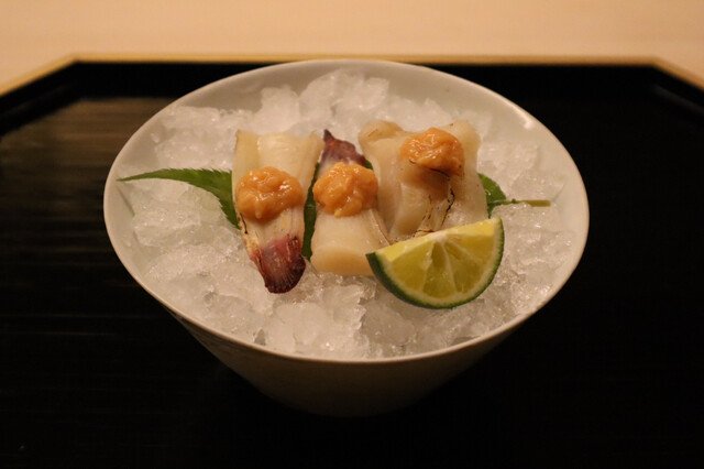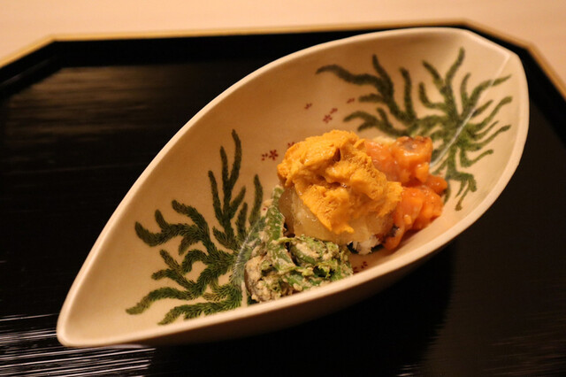 スタートは岡山県産の渡り蟹とこごみの胡麻和え、上には雲丹を乗せた贅沢な逸品。