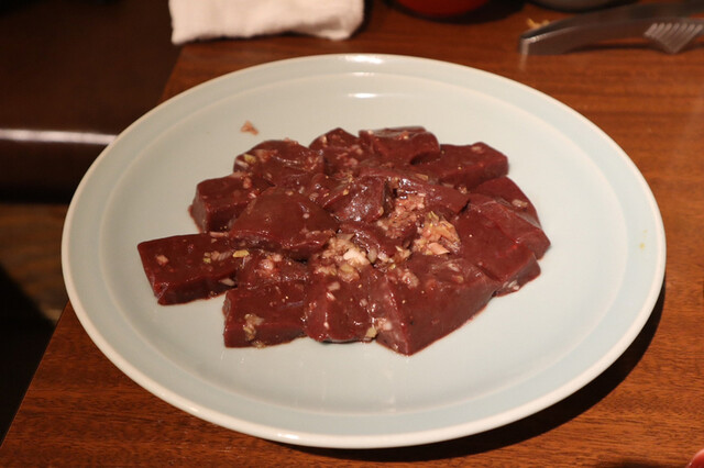 鮮度の高さが伺える角張った形状のレバーは焼き台で炙りいただく!プルプル感溢れるレバをごま油でいただくのが至高!