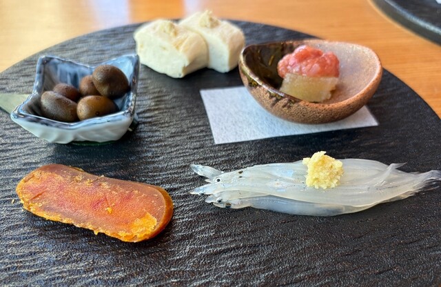 カラスミやシラウオ、ウツボ、赤酢の握り、中トロ、光もの、イクラご飯などバラエティのあるおまかせコースに大満足。