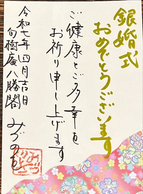 食事中に女将が挨拶に来られて、銀婚式のお祝いをいただくサプライズもあり、『みづのを』さんのおもてなしにも感激です。