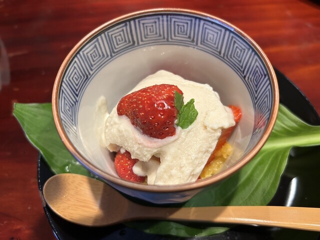 最後のデザートも大好きでした。夏みかんとマーマレード、胡麻シャーベット、おおはらのミント、朝取れいちごなのだそうですが、甘さとマーマレードのにがさ、夏みかんの酸味、印象に残る美味しさでした。