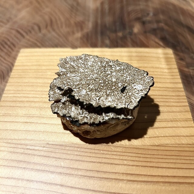 クロスティーニとは小さなトーストという意味。ライ麦パンの上にヤギのチーズとサマートリュフがのっております!口に近づけなくてもトリュフの香りが香ってきて幸。食べる前も食べている最中も食べた後も終始トリュフが香ります☺️クセのあるチーズがアクセントになっていてバランスも良い!手で掴んでいただくのもコースに幅が出て良き✌️