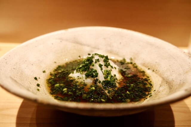 鯵 まず上のネギがうまい 食べた瞬間に脳がウマいと反応してしまう 2回咀嚼したらわかる やばいやつだと 噛めば噛むほどうまい 気づいたら口から消えている
