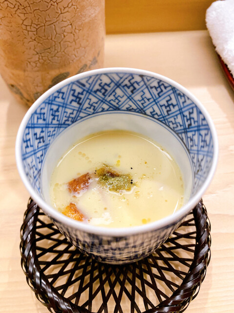 あん肝と一緒に提供される日本酒。口の中にあん肝が少し残っている時に、日本酒を頂きますとなくなりかけたあん肝の旨味が信じられないほど口いっぱいに広がります。これが本物のマリアージュかと。長く続く香りと旨みに本当に感動しました。