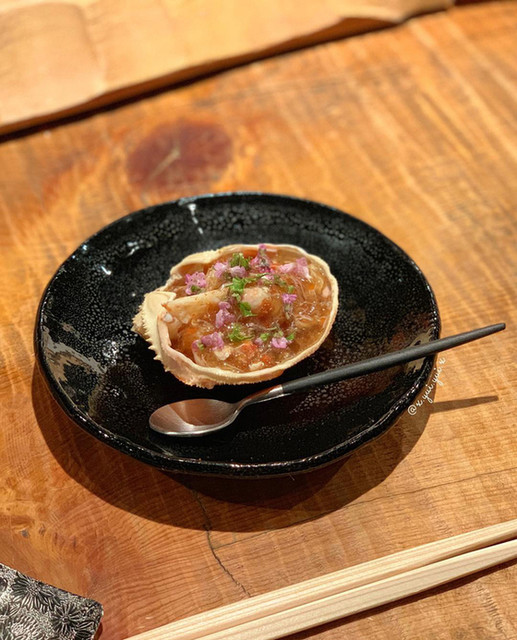蟹味噌をお酒でのばしてカニ身と和えたものは木の芽の香りがふんわりやさしい/////
