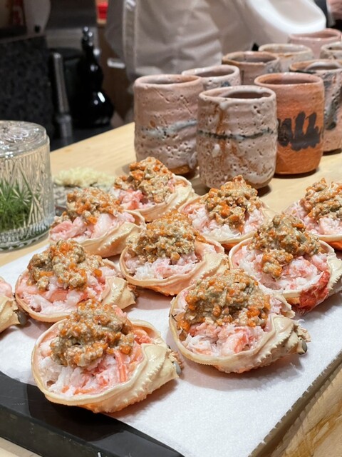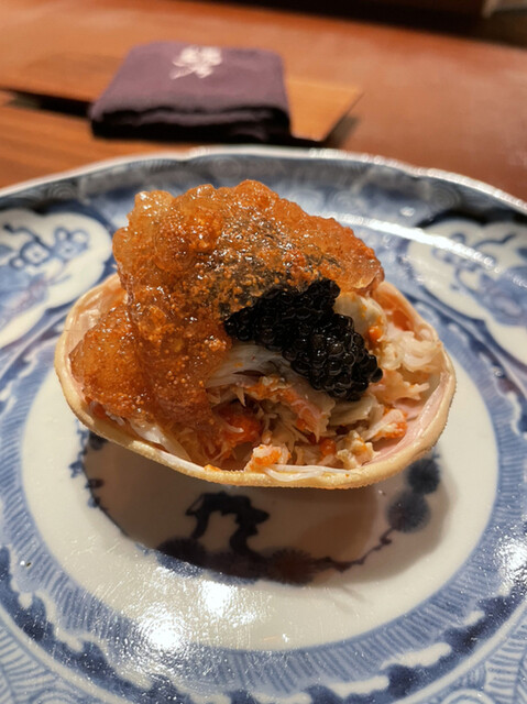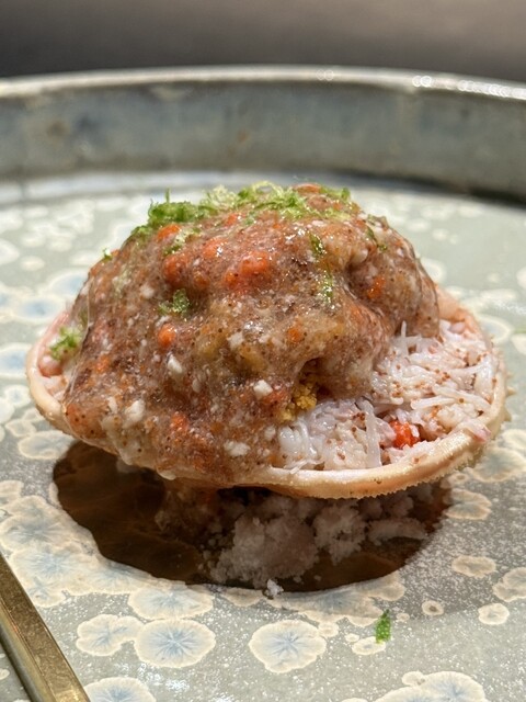 紹興酒漬けにした大ズワイガニの雌に蟹の外子と内子、雲丹と卵黄の濃厚さと風味がやばうま