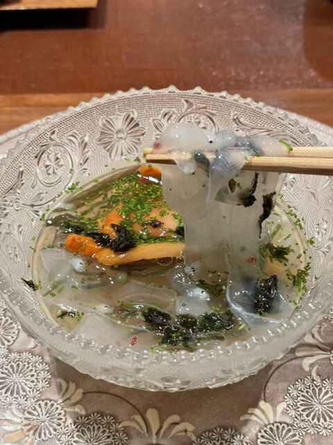 雲丹たっぷりのっ優しいジュレに巣立ちの風味がふわぁぁ♥貝はじゃきっと感ものこしつつ、ふわっと♥海老もしっとりぷりぷりで雲丹も甘くて美味しい(◍˃ ᵕ ˂◍)