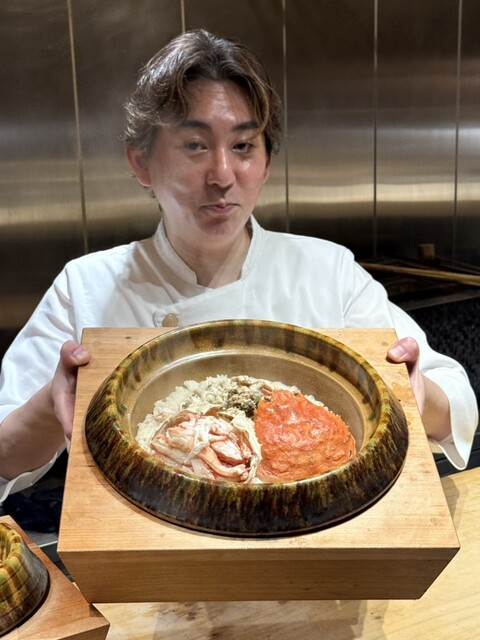 紹興酒漬けにした大ズワイガニの雌に蟹の外子と内子、雲丹と卵黄の濃厚さ、そしてご飯は芯はあるけどミルキーで激うま✨