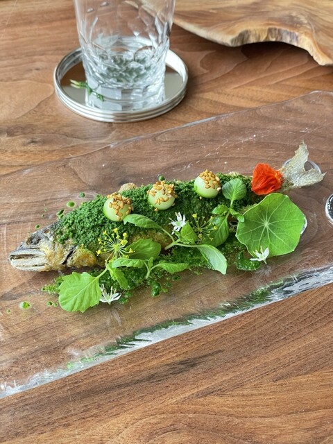 鮎って好きかどうかと言われると得意な方ではないけど、ほんとに鮎自体もおいしくて、しっぽのカリッと感や身の優しさと、旨み、きゅうりの食感、野生のルッコラやハーブの風味もやさしくてほんとに美味しかった❣️