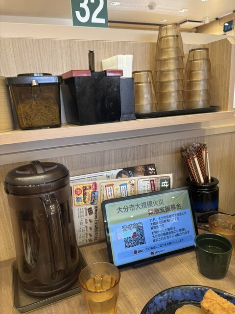 テーブルの端にピッチャー、コップ、箸、とろろ昆布、揚げ玉が揃っていて清潔感があります。