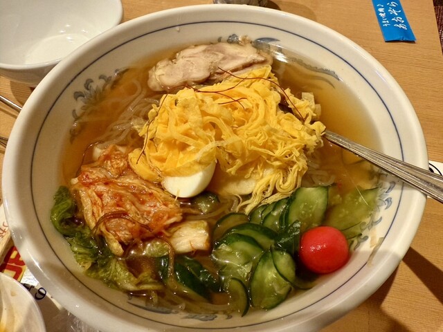 最後にいただいた冷麺は、まさにシメにぴったりの一品。透明感のあるスープは爽やかでコクがあり、麺はコシがしっかりしていてツルツルと喉越しも良い。キムチや野菜もたっぷりで、ボリュームも満足です。