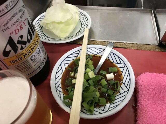 三時過ぎで客は5分の入り。カウンターの奥、焼き場の前に案内されてビールと豚足を注文。愛想のいい対応してくれた年配の男性はまさに中国語でいうラオバン(老板)のイメージ。ねぎダクのたれの小皿とさらにもう一皿ねぎマシが出てくる。
