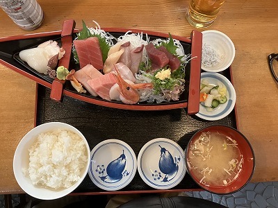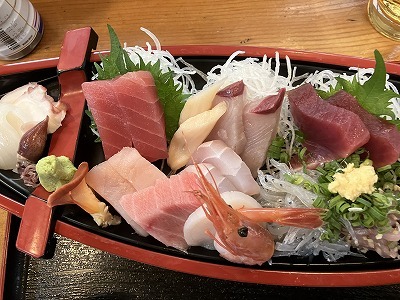 やって来ましたお一人舟盛り 最初はかまぼこ板で作ったような、お子様舟盛りを想像していたが、なんのなんの充分に2~3人前はある立派な舟で驚いた