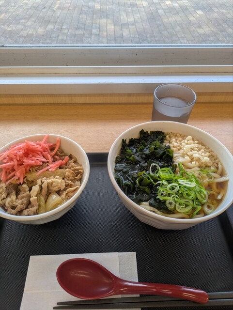 チョイスしたメニューは、わかめうどんの大盛りと、ミニ牛丼のセット♪